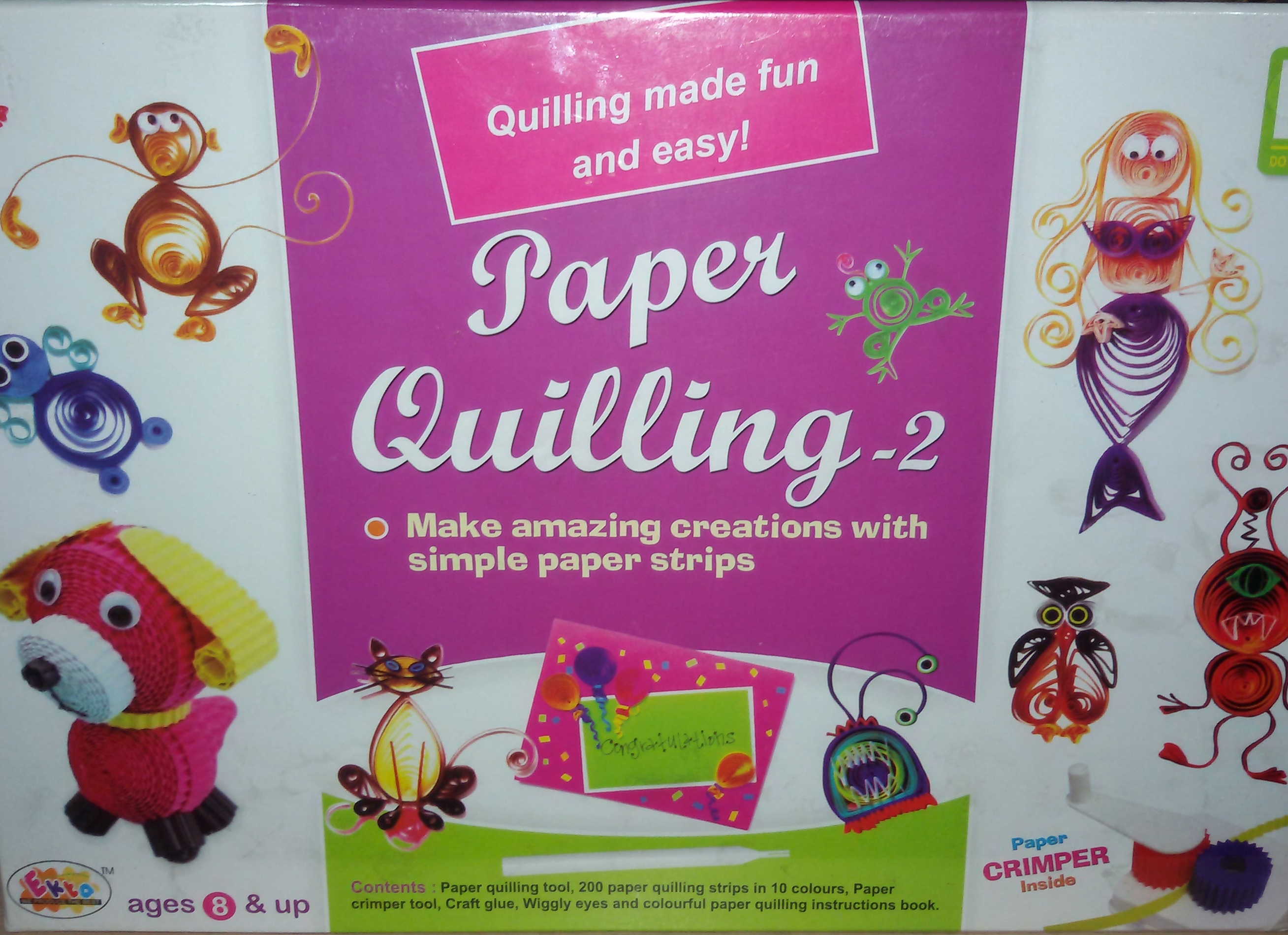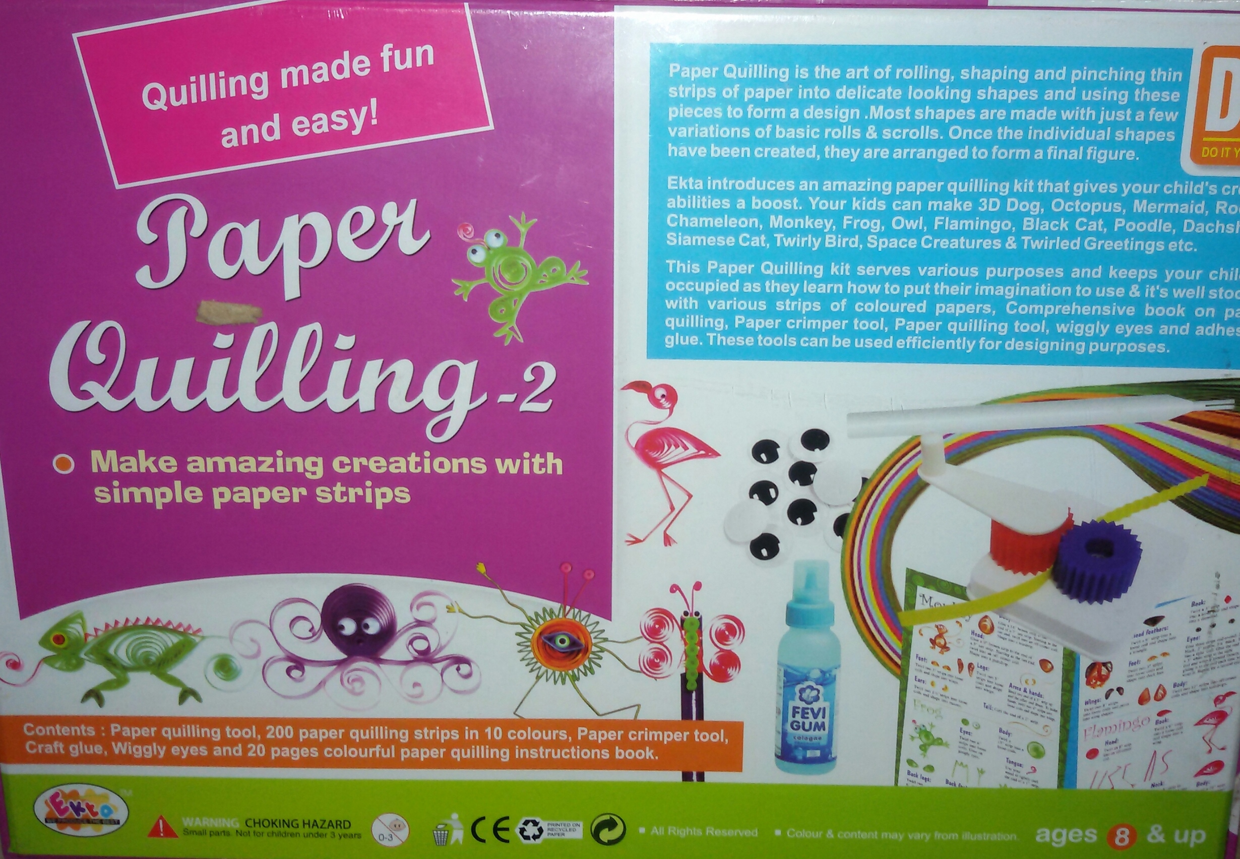 Ekta introduces an amazing paper quilling kit that gives your child’s creative abilities a boost. Your kids can make 3D Dog, Octopus, Mermaid, Rooster, Chemeleon, Monkey, Frog, Owl, Black Cat, Poodle, Dachshund, Siamese Cat, Twirly Bird, Space Creatures & Twirled Greetings etc.