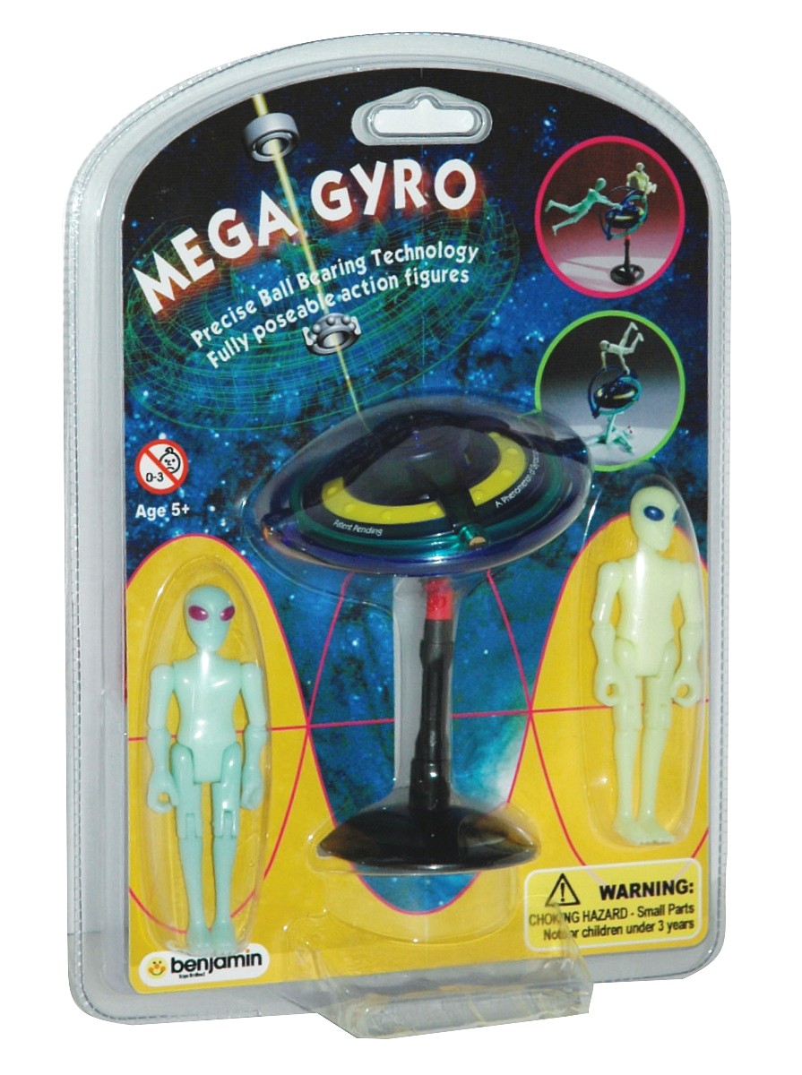 High tech gyroscope with 2 poseable action figures that can balance as it spins. No battery required.