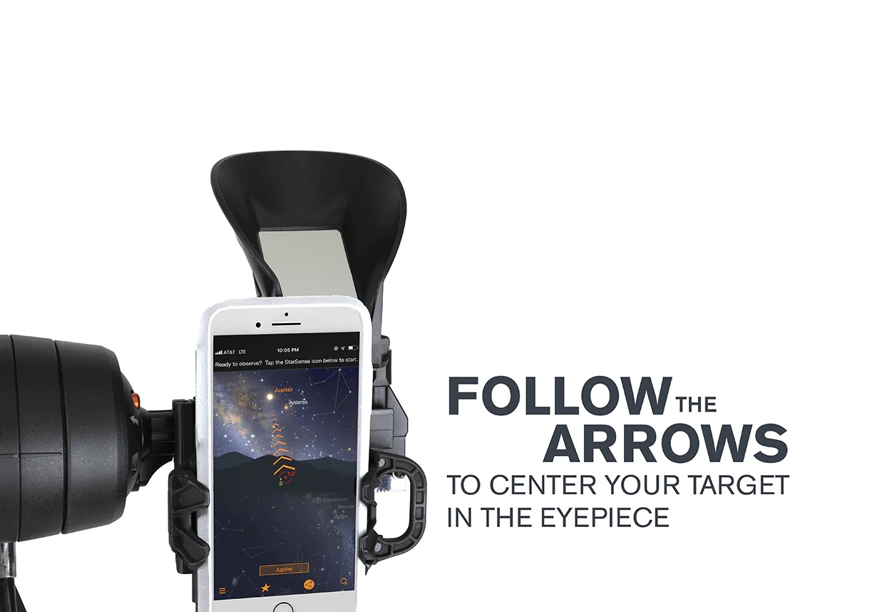 Leave complicated star charts, imprecise planetarium apps, and computerized mounts behind. With StarSense Explorer, locating objects has never been easier, faster, or more accurate. Within minutes of setting up the telescope, you’ll be navigating the sky with confidence. Simply place your phone in the unique StarSense dock and launch the StarSense Explorer app. After aligning your phone to the telescope’s optics (a quick, 2-minute procedure), StarSense Explorer generates a list of celestial objects currently visible. Make your selection and arrows appear onscreen, guiding you as you to move the telescope. When the object is ready to view, the bullseye turns green.